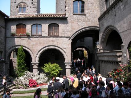 Dal campanile, che presenta un piano in più dell’originale, si affacciano alcuni fedeli curiosi.