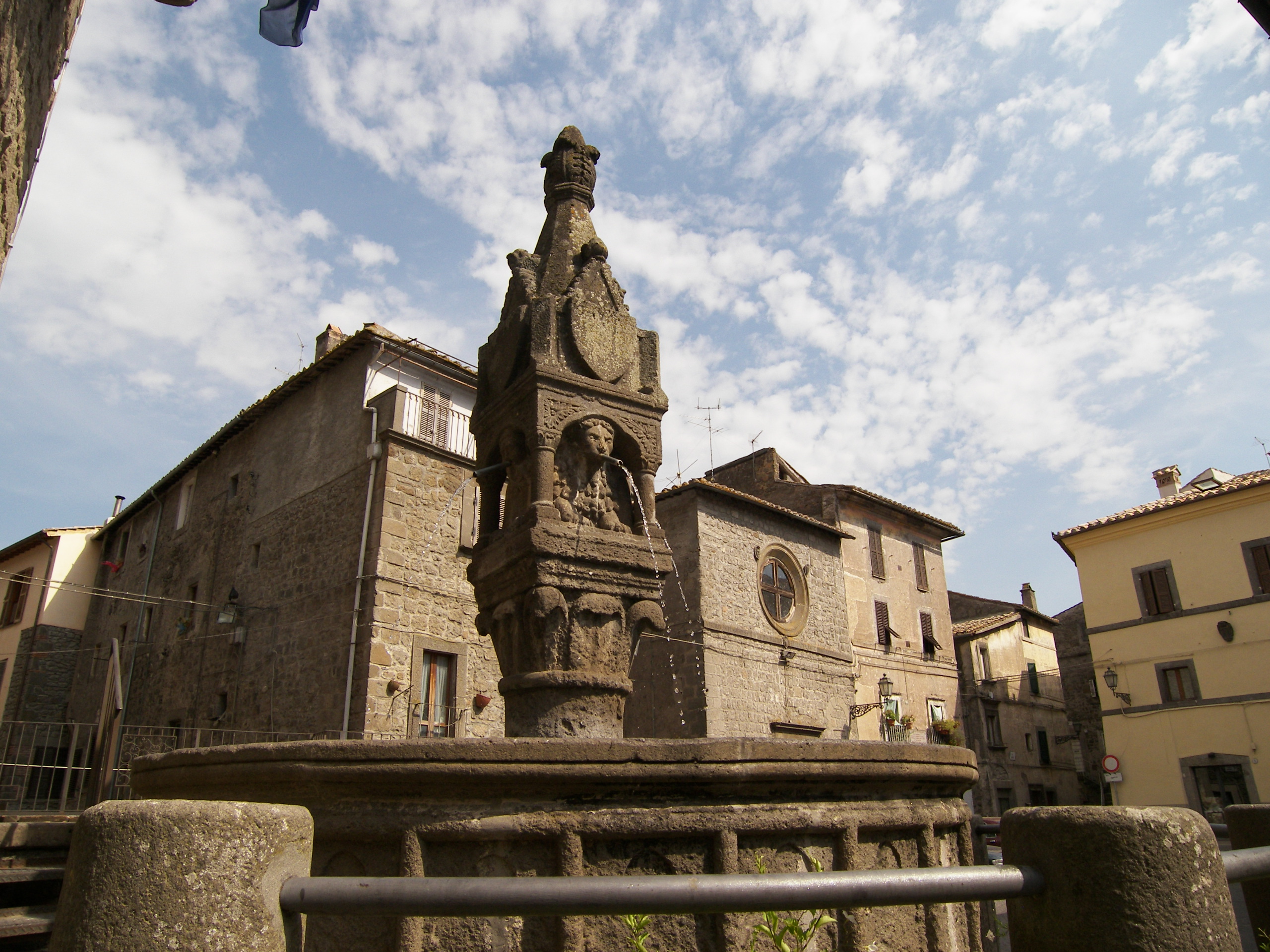 Altro monumento, degno di nota è la Fontana a fuso, capolavoro d’arte scultorea di scuola viterbese, cosi chiamata per la sua forma. Si trova alla base della torre dell’orologio e venne realizzata tra il 1200 e il 1300, interamente in peperino.